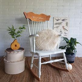 Elegante e robusta sedia a dondolo con dettagli, legno a vista e scritte decorative. Di grande effetto e molto comoda davanti ad un camino, in soggiorno o camera da letto come sedia da lettura, da allattamento e relax. . NON SPEDISCO . Per vedere altri miei lavori: pagine social FB e IG Shabbylife e shabbylife punto it