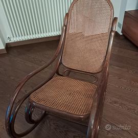 Vendesi iconica sedia a dondolo in stile Thonet, un classico intramontabile del design del primo '900. Realizzata in pregiato legno di faggio curvato a vapore con finitura scura, caratterizzata dalle inconfondibili volute laterali che ne definiscono la linea elegante e sinuosa.