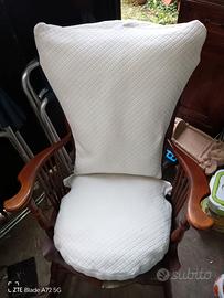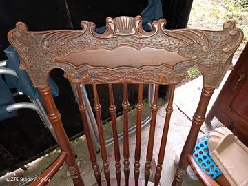 sedia a dondolo in legno, vintage, schienale parte alta intarsiata, seduta con forma anatomica, cuscini di copertura per seduta e schienale.