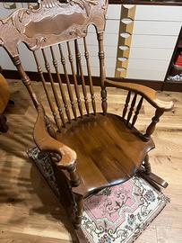 La struttura è in legno pieno con gambe tornite e supporti curvi per il dondolio.