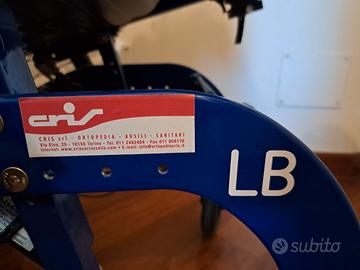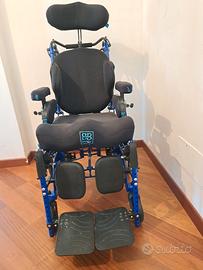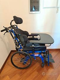 Carrozzina basculante modello LEVIA completa di sistema di postura personalizzato, cuscino antidecubito, poggiatesta regolabile, spondine laterali imbottite, bretellaggio e cintura, tavolino (nuovo, mai utilizzato), poggiapiedi, poggiapolpacci.