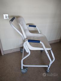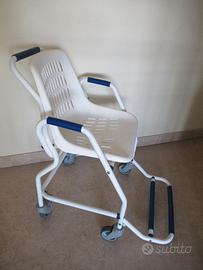 Sedia a rotelle da bagno per doccia marca Herdegen (Paris) praticamente nuova mai usata. Il dispositivo ha ruote con freno e il poggia piedi movibile coma da foto. È in leggero metallo cromato e plastica di ottima qualità. La seduta è ad un'altezza da terra di circa 53cm, con l'appoggia piedi ovviamente l'altezza si accorcia. il sedile ha una profondità di circa 36 cm e una larghezza di circa 45 cm. La distanza tra i due braccioli è di circa 49 cm. La sedia esternamente ha una larghezza massima di 58 cm circa e una profondità massima di 60 cm circa. Il dispositivo viene proposto a € 85,00.