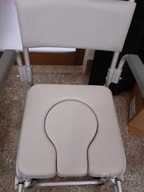 Sedia a rotelle per agevolare il trasporto di persone con difficoltà alla deambulazione per l'evacuazione, con pratico secchio estraibile, per evitare spostamenti in caso di degenza o altra patologia limitante.