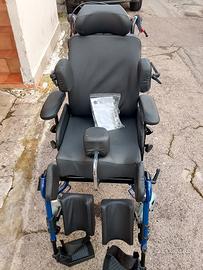 sedia a rotelle polifunzionale seduta e schienale anatomici in poliuretano rivestiti in nylon nero lavabile comprese di fasce di protezione nuovissima