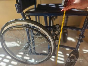 Sedia a rotelle, sedia per disabili. Per fortuna mai usata. Con scatola di cartone originale pagata 250 Euro. Gomme ripiene, supporti per piedi e supporto laterale smontabili per un facile spostamento, difatti le ruote non superano la seduta.