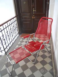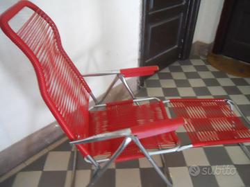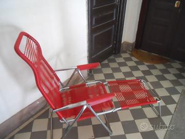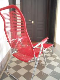 Splendida sedia a sdraio vintage rossa, pieghevole, fusto in metallo e tondino di plastica, con appoggia gambe, anni 60.