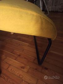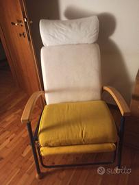 Comoda sedia allungabile con braccioli in legno, struttura robusta in metallo, poggiatesta estraibile, completamente sfoderabile, in vivace tessuto giallo tipo Alcantara. Chiusa cm.100 ( con poggiatesta, profonditá cm.88 ( chiusa)