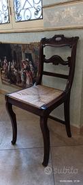 La sedia a grandezza normale, presenta chiare influenze dello stile Duncan Phyfe, un rinomato designer di mobili americano del XIX secolo. Questo stile è noto per le sue linee eleganti, le forme sinuose e l'uso di decorazioni raffinate. Infatti lo schienale presenta una forma curva e traforata, con un motivo decorativo intagliato.