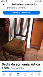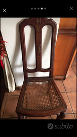 Vendo 100? Sedia antica adatta per scrivania o scrittoio oppure da salotto, in legno dipinto con alto schienale e seduta in vimini originale dell'epoca, completa di cuscino a forma fatto dal Tapezziere in velluto color oro con passamaneria , la sedia è in buono stato e non necessita di particolare restauro