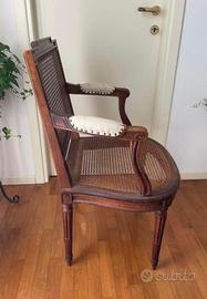 Vendo elegante sedia d’epoca in legno con schienale e seduta in paglia di Vienna + braccioli foderati in tessuto bianco.