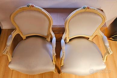 1 Sedia usata ma in buono stato con braccioli in stile barocco, dalla fabbrica SILIK, collezione lo Stile di Classe. La struttura è realizzata in legno massello naturale e decorata con sculture artistiche foglia Oro. (Come da foto .....2 sedie disponibili..)
