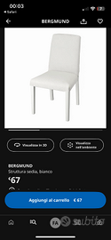 Sedia Bergmund sfoderabile Ikea (prezzo nuovo della sola struttura 67 euro come da foto sito Ikea) in vendita 30 euro al pezzo. Intero stock 4 sedie 100 euro. I coprisedia sono Ikea originali ma sono usurati, possibile acquistare da Ikea diversi coprisedia bergmund di vari colori e tessuti.