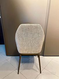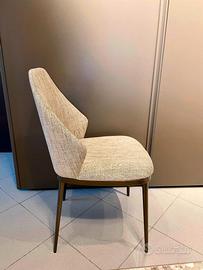 Sedia Bonaldo modello Mida. Struttura in acciaio e multistrato di legno. Imbottitura: gomma indeformabile ad alta densità, rivestimento in Tessuto Special EA46. Base metallo bronzo. Confezione da 4 sedie.