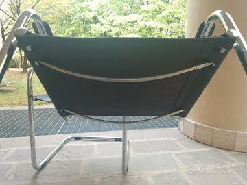 Sotto la seduta tengono in tiraggio due tiranti ad arco regolabili cromati.