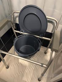 Struttura in tubo di alluminio anodizzato con confortevole sedia in vinile e secchio in plastica, braccioli in plastica e puntali in gomma antiscivolo. Regolabile in altezza ogni 2,5cm. Comprende quattro funzioni in una: rialzo per water, supporto per water, sedia comoda e sedile per doccia