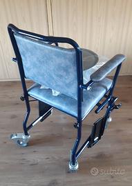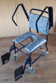 Sedia comoda con wc estraibile, sponde rialzabili, pediere ripiegabili, quattro ruote pivottanti di cui due con freno, istruzioni.