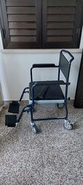 Sedia comoda con WC incorporato e adatta anche per andare in DOCCIA, con telaio in alluminio verniciato, quattro ruote e poggia piedi. Nuova mai usata. PREZZO TRATTABILE.