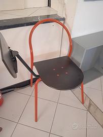 Sedia in metallo, struttura rossa, sedile in legno tipo laminato nero con bordo nero.