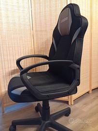 Sedia da gaming RANDRUP di LEGEND. La seduta è rivestita in tessuto a rete nero traspirante con dettagli in similpelle grigia. L57 x H97-107 x P63 cm