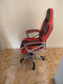 Sedia da gaming nera e rossa in ecopelle ancora ben funzionante con piccoli segni di usura. Ha strappi sul bracciolo sx probabilmente riparabili con una toppa adesiva per il resto si mostra come in foto. Ritiro in sede Firenze zona piazza Beccaria