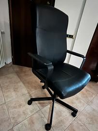 Vendiamo comodissima sedia con ruote in pelle nera, adatta al lavoro alla scrivania, regolabile in altezza. Leggermente rovinati i braccioli.