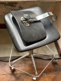 Affascinante sedia da lavoro vintage, realizzata tra gli anni ’60 e ’70 in Germania. Struttura in acciaio cromato con base a cinque razze e rotelle, seduta e schienale imbottiti in similpelle nera. Altezza e schienale regolabili.
