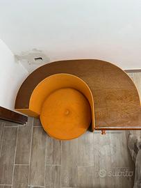 Sedia da salotto 97x62x58 LxAxP. Questo mobile è un comodino con seduta integrata. Era abbastanza comune negli anni '70 e '80, soprattutto in ambienti come camere da letto o spazi di attesa. Il design particolare, con la seduta rotonda imbottita (in questo caso arancione) integrata in una struttura che include anche un piano d'appoggio e un piccolo armadietto o cassetto, è tipico dell’arredamento vintage o retro.