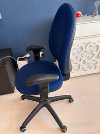 Sedia da scrivania blu con braccioli, regolabile in altezza e in inclinazione. Schienale alto.