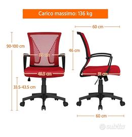 Sedia da Scrivania Ufficio Altezza Regolabile con Braccioli Girevole a Rotelle Ergonomica Lombare Reclinabile in Rete Traspirante Rossa Portata 136 kg. Completamente nuova ancora imballata nel cartone.