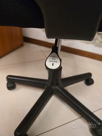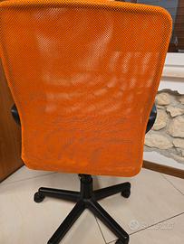 Sedia da scrivania che si alza e si abbassa tramite levetta sotto la seduta, con rotelle per spostamento pratico, seduta che si gira a 360gradi molto comoda e non fa sudare la tela è traspirante. il colore è nero e arancione.