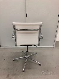 Questa sedia ha un design moderno ed elegante, con struttura cromata e una seduta in tessuto o rete di colore bianco. È dotata di braccioli metallici con imbottiture e una base a cinque razze con rotelle. Inoltre, dispone di una leva per regolare l’altezza, tipico delle sedie da ufficio ergonomiche.