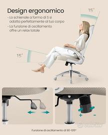 Nuova sedia da ufficio girevole con braccioli ribaltabili, poggiatesta, supporto lombare e regolabile in altezza. L'altezza della seduta è regolabile da 44 a 55 cm, e l’inclinazione può essere sbloccata per un moto ad ondeggiamento. La seduta è morbida, imbottita con gommapiuma ad alta densità. Molto comoda e facile da montare, adatta per lunghe ore alla scrivania.