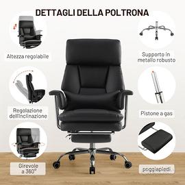 la poltrona direzionale con Poggiapiedi è realizzata in pelle PU di alta qualità, Può essere ruotato di 360°ed è regolabile in altezza. Lo schienale è inclinabile e il sistema di inclinazione/rotazione consente di inclinare la sedia fino a 135°. Sedia da Computer con Cuscino Ispessito e Supporto Lombare 200kg, Nero. Usato 1 settimana. Imballo originale. Ci vogliono circa 30-40 minuti per montarla. Disponibile per la spedizione: BRT. Pesa 25/30Kg.