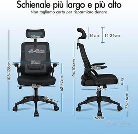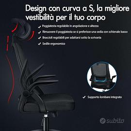 Sedia da Ufficio ergonomica per Home Office, Sedia in Rete per Computer con Supporto Lombare Dinamico Poggiatesta Bracciolo Ribaltabile Sedia Girevole Inclinabile, Nero