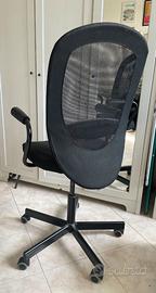 Sedia da ufficio IKEA Flintan dotata di braccioli. La sedia è stata acquistata una decina di anni fa, normali segni di usura che per una sedia da ufficio non sono notevoli. Ancora perfettamente funzionale, necessita solo di una pulizia dei tessuti. Vendo perché, causa trasloco insieme a compagna, mi ritrovo con due esemplari.
