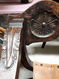 Seduta in cuoio inserita recentemente per poterla utilizzare come seduta. Lavorazione dell'appoggio a rosoni motivo ripreso nei braccioli e nell'incrocio in basso delle zampe a forma di leone. Prezzo trattabile.