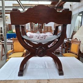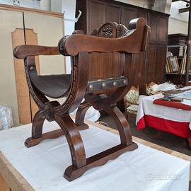 Sedia Dantesca neorinascimentale in rovere massiccio, anni 50, origine Spagna, con bracioli, frontale e schienale intagliati, e con seduta originale in cuoio marrone molto spesso, rinforzato sul davanti e tenuto in pisizione da borchie di grandi dimensioni.