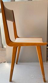 Sedia design anni 70 in legno e rivestita in pelle. Altezza seduta cm.42, dimensioni seduta cm.41x39, altezza spalliera cm. 85. Condizioni: molto buone rivestimento e legno. Nel tempo sono state eseguite delle riparazioni alla parte lignea sotto la seduta visibili in foto.