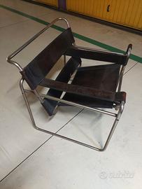 La sedia è famosa e di impatto d'arredo notevole. Questa necessita di manutenzione, una parte della pelle è da ripristinare e il telaio è da ricromare