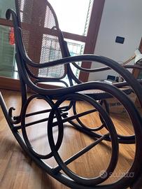 Sedia a dondolo in faggio ricurvo tinto mogano. Schienale, seduta in paglia di Vienna incannucciati.