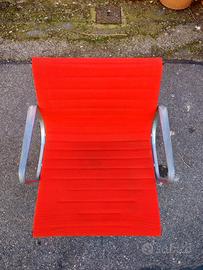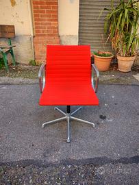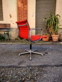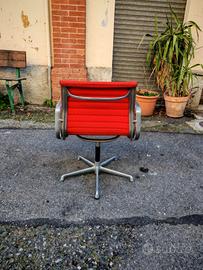 Vendo iconica seduta "Aluminium Group" disegnata da Charles & Ray Eames. Pezzo originale prodotto in Italia da ICF su licenza Herman Miller (etichetta originale sotto la scocca come in foto). Struttura in pressofusione d'alluminio e rivestimento in tessuto rosso originale con cuciture orizzontali. Condizioni: La sedia è solida e il tessuto è in buone condizioni senza strappi. La struttura in alluminio presenta una patina del tempo che ne certifica l'originalità (eventualmente lucidabile). Base girevole, senza rotelle. Un pezzo di storia del design perfetto per uffici di prestigio o home-office di classe. Preferibile ritiro a mano a Torino, contattatemi per concordare un eventuale spedizione.
