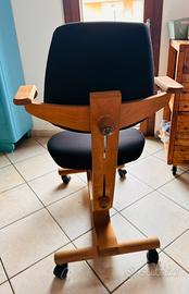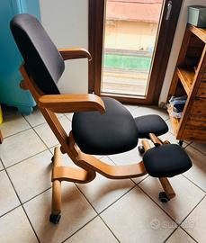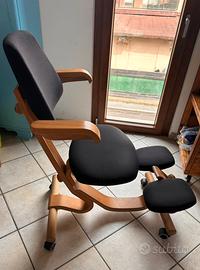 Sedia ergonimica Rybo Varius struttura in legno. A differenza della stokke e delle altre, ha la possibilità di regolare la seduta e gli appoggi per le ginocchia e lo schienale, in base alla propria altezza. Inoltre è dotata di braccioli e di ruote, che la rendono comoda anche per spostarsi. In ottime condizioni, come da foto