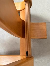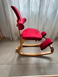 Caratteristiche Principali • Design Dinamico: La struttura a slitta invita al dondolio, supportando la colonna vertebrale e la libertà di movimento. • Massima Regolabilità: Rispetto al modello base, offre schienale regolabile (altezza e profondità) e poggia-ginocchia personalizzabili. • Versatilità d'uso: Lo schienale con "ali" permette di appoggiare i gomiti o di sedersi al contrario, usando lo schienale come supporto per il torso. • Materiali di Qualità: Struttura in multistrato di faggio e frassino (naturale o nero) con ampia scelta di tessuti eco-sostenibili.
