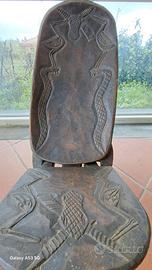 Vendo sedia etnica pieghevole in legno massello con intagli decorativi raffiguranti animali e motivi geometrici tribali.