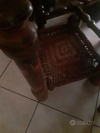 sedia etnica in legno tek e corda con intarsi decorati e specchietti sullo schienale, altezza max 75cm, larghezza max 50cm, profondità max 47cm. Solo consegna a mano.