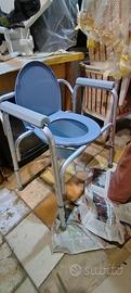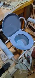 Sedia evacuativa regolabile in altezza, pieghevole, con telaio in alluminio. Fornito di water chiuso e secchiello con coperchio lavabile. Utilizzabile come rialzo per il wc, doccia e sedia comoda.