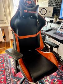 Vendo sedia da gaming Cougar nera con dettagli arancioni.