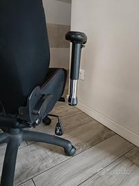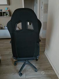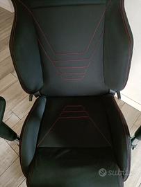 Bellissima sedia da gaming o da ufficio, presenta una seduta avvolgente di colore nero con cuciture rosse a contrasto Replica lo stile dei sedili sportivi da auto