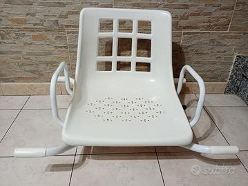 Sedia Girevole con braccioli per Vascaha un interno misurante da 46 a 62 cm in acciaioverniciato bianco. Dotata di2 perni di sicurezzache bloccano saldamente l’ausilio ai bordi interni della vasca, evitando spostamenti indesiderati. condizioni ottime, manca solo un gommino di protezione