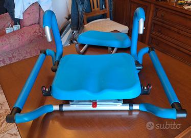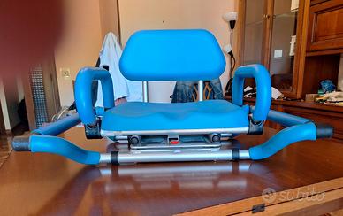 Sedia girevole per vasca da bagno con struttura in alluminio e imbottiture in poliuretano morbido. Possibilità di rotazione a 360° in quattro posizioni con leva di blocco per la seduta. Braccioli e schienale estraibili. Regolazione in larghezza. Usato pochissimo.